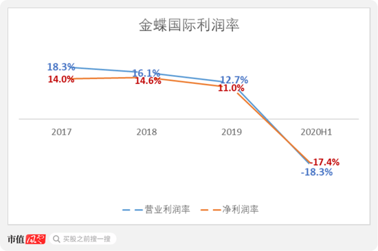 由于金蝶国际在2020年上半年采取了更激进的云业务策略,砍掉其一部分传统ERP业务,其营业利润率和净利润率均由正转负,分别为-18.3%和-17.4%。