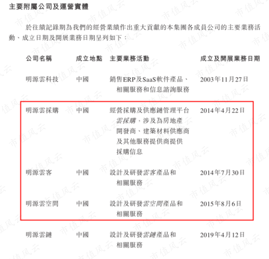 明源云采购、明源云客和明源云空间均成立于2017年前。但明源云客和明源云空间的主要业务为设计及研发公司产品,不涉及对外销售。