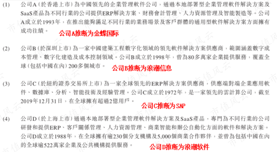 风云君根据招股书及公开资料推断,这4家竞争对手按市场份额大小应依次为:金蝶国际(6.2%)、浪潮信息(6.0%)、SAP(4.6%)和浪潮软件(4.1%)。