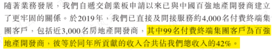 另外,明源云还在招股书中披露,自2011年递交创业板申请以来,已经与中国百强地产开发商建立了更牢固的关系。2019年,99名百强地产开发商贡献了公司总收入的42%。