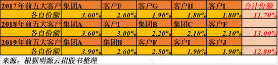 2019年,公司前五大客户的合计收入为12.8%,与2017年的11.7%及2018年的13.0%相比,前五大客户集中度并未出现明显变化。