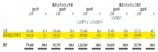2020年一季度,公司来自区域渠道合作伙伴的销售额占比为51.3%,且该占比在近年来上升明显,在2017年时仅为32.1%。