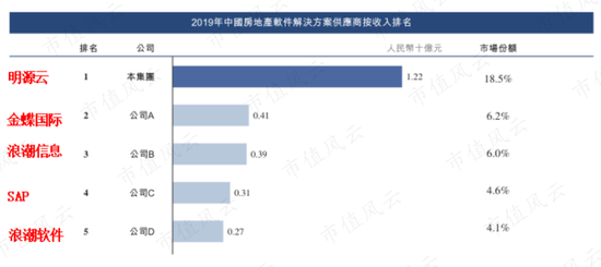 按2019年收入计,国内前五大房地产管理软件供应商的合计市场份额为39.3%,其中明源云的市场份额为18.5%,排名第一。