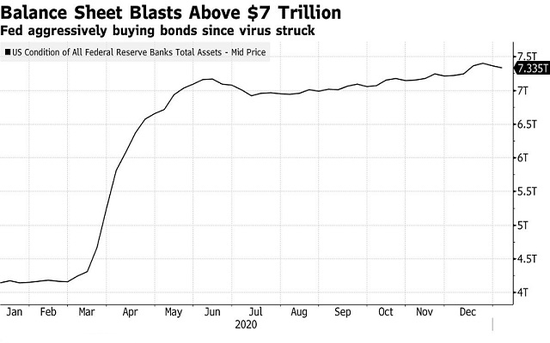 如下图所示,自爆发疫情以来,美联储大举购买债券,目前其资产负债表已经突破7万亿美元