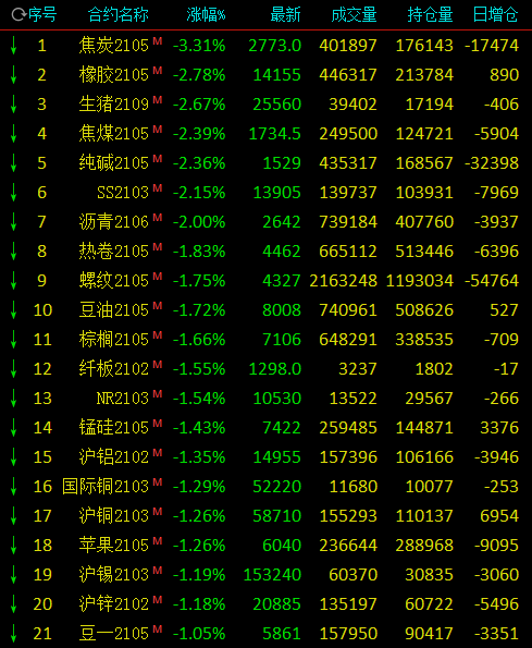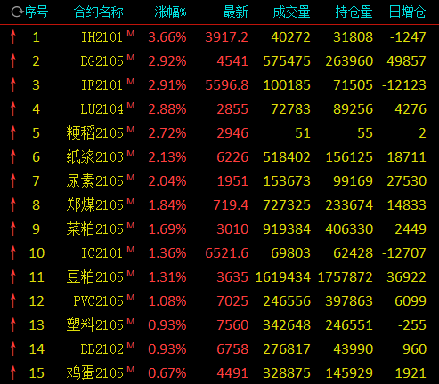 热点栏目1月12日,国内商品期货收盘多数下跌,股指大涨,IH涨近4%,IF涨近3%;能化品分化,乙二醇、低硫燃料油涨近3%,纸浆、尿素涨逾2%,橡胶、沥青跌逾2%。基本金属方面,沪镍日内低点反弹近3%;农产品方面,生猪跌逾2%;黑色系方面,焦炭跌逾3%,动力煤涨近2%。