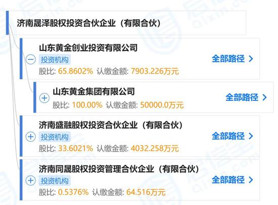 启信宝信息显示,山东黄金集团有限公司旗(金麒麟分析师)下的全资子公司山东黄金创业投资有限公司(以下简称黄金创投)为济南晟兴和济南晟泽的第一大单一股东,分别持股28.37%和65.86%,进而借此间接持有能辉科技2.85%的股份。