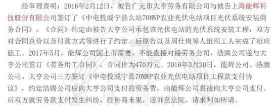 不过,记者注意到,以贵州省第一个农光互补光伏电站项目——能辉科技所谓的“标杆性项目”——威宁县么站60MWp农业光伏电站项目来说,贵州省威宁县人民法院2019年11月出具的一份裁判书显示,能辉科技将该光伏电站的光伏系统安装工程承包给了广元市大亨劳务有限公司(以下简称大亨公司)。
