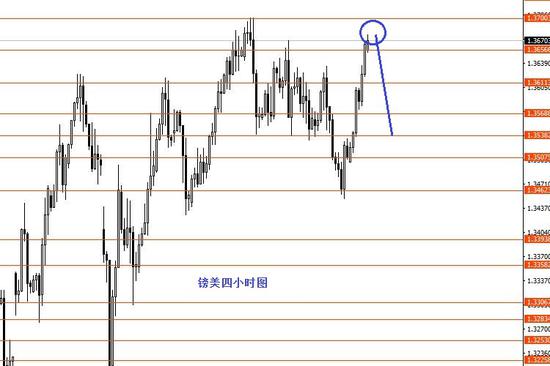 英镑昨日再次向上运行,上涨力度较大,汇价快要接近前期高点1.3700区域,此区域看多不做多,保守者观望,激进者做多:1.3670-1.3700区域做空英镑,止损1.3730,目标先看向1.3610,若能跌破再看向1.3570和1.3540区域。控制仓量,严格止损。