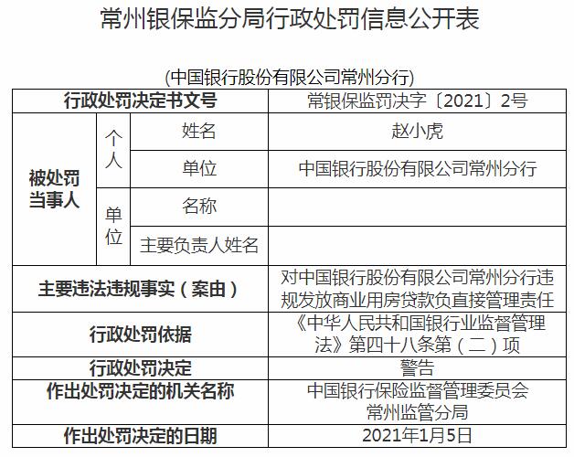 同日公布的常银保监罚决字〔2021〕2号显示,赵小虎对中国银行股份有限公司常州分行违规发放商业用房贷款负直接管理责任,被警告。中国银行保险监督管理委员会常州监管分局作出处罚决定的日期是2021年1月5日,行政处罚依据是《中华人民共和国银行业监督管理法》第四十八条第(二)项。