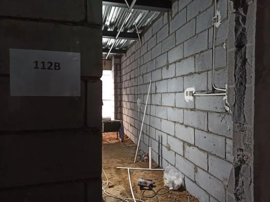 大楼内部却是另一派施工景象,工人们忙着运送泥沙和建材铺设。也许是为了方便销售,每个房间的房号已经早早地张贴出来,和这里粗犷原始的施工环境显得有些格格不入。