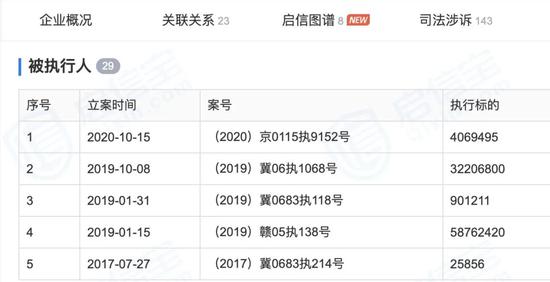 启信宝显示,目前该公司共涉及司法诉讼143起,广泛涉及民间借贷、借贷合同纠纷、不当得利纠纷等方面,成为被执行人高达29次。
