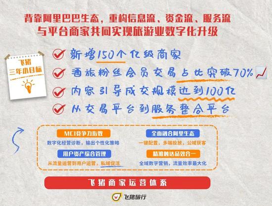 至于未来,飞猪还提出了坚定的目标:在未来三年内扶植新增150个年交易额过亿的商家、酒旅粉丝会员交易占比突破70%、内容引导成交规模达到100亿。