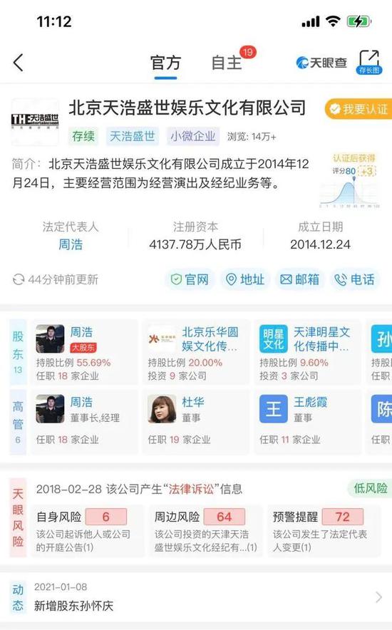 天浩盛世是内地娱乐圈知名经纪公司。据天眼查数据,周浩为北京天浩盛世娱乐文化有限公司的第一大股东,持股比例为55.69%;第二大股东为北京乐华圆娱文化传播股份有限公司,持股比例为20%,目前杜华担任该公司董事职务。
