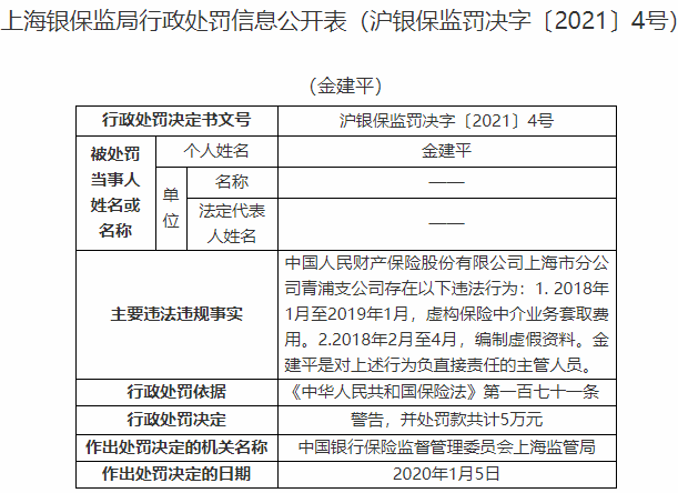 中国经济网北京1月15日讯中国银保监会网站昨日公布的上海银保监局行政处罚信息公开表(沪银保监罚决字〔2021〕4号、5号)显示,中国人民财产保险股份有限公司(以下简称“人保财险”)上海市分公司青浦支公司存在两宗违法违规行为,2018年1月至2019年1月,该公司虚构保险中介业务套取费用;2018年2月至4月,该公司编制虚假资料。金建平是对上述行为负直接责任的主管人员。
