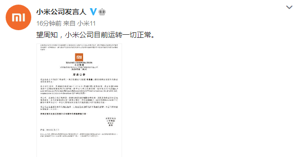 随后,小米公司发言人微博也对此事进行回应称,小米公司目前运转一切正常。