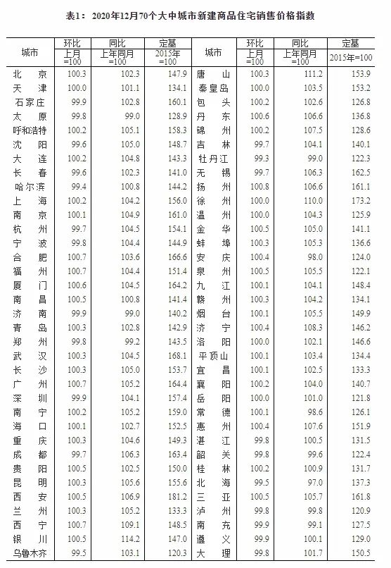 2020年12月70个大中城市新建商品住宅销售价格指数。截图自国家统计局官网