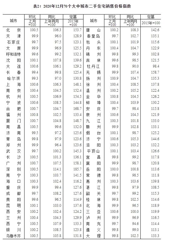 2020年12月70个大中城市二手住宅销售价格指数。截图自国家统计局官网