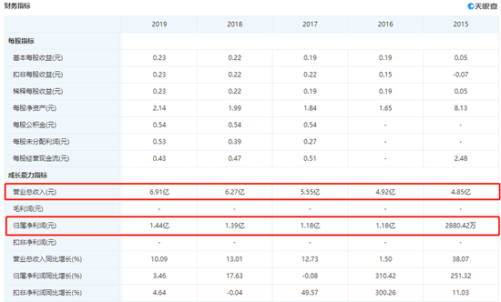 财务指标方面,2015年至2019年,公司营收从4.85亿元增加至6.91亿元,归属净利润从2880.42万元大幅增加至1.44亿元。