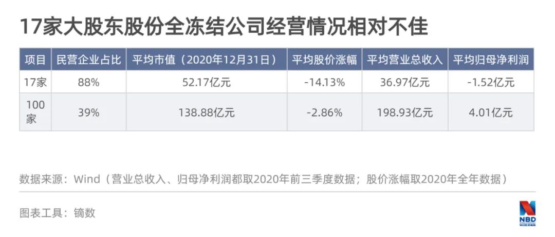 值得注意的是,这100家在2020年内频繁更换董事长的公司中,有17家公司大股东累计冻结股份数占持股比例为100%,意味着这17家公司的大股东陷入法律风险,大股东对上市公司的支持力度被削弱,风险因素还有可能扩展到上市公司。数据统计显示,这17家公司的业绩、投资回报等状况都更令人担忧。