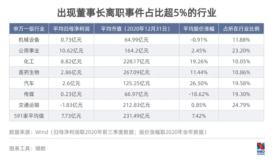 疫情给各个行业带来的冲击不尽相同,梳理591家在2020年出现董事长离职事件的上市公司的行业分布,《每日经济新闻》记者发现,占比超过5%的有7个行业,多数行业表现不及平均值,其中平均年末较年初股价跌幅最大的是传媒行业,平均下跌18.62%。