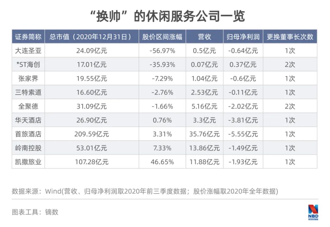 9家“换帅”的休闲服务公司中,亏损额最大的是首旅酒店(600258,SH),2020年前三季度归母净利润亏损5.55亿元——实际上,9家公司中仅有一家实现前三季度盈利,而这家公司还是“披星戴帽”的*ST海创(600555,SH),前三季度归母净利润为0.37亿元。