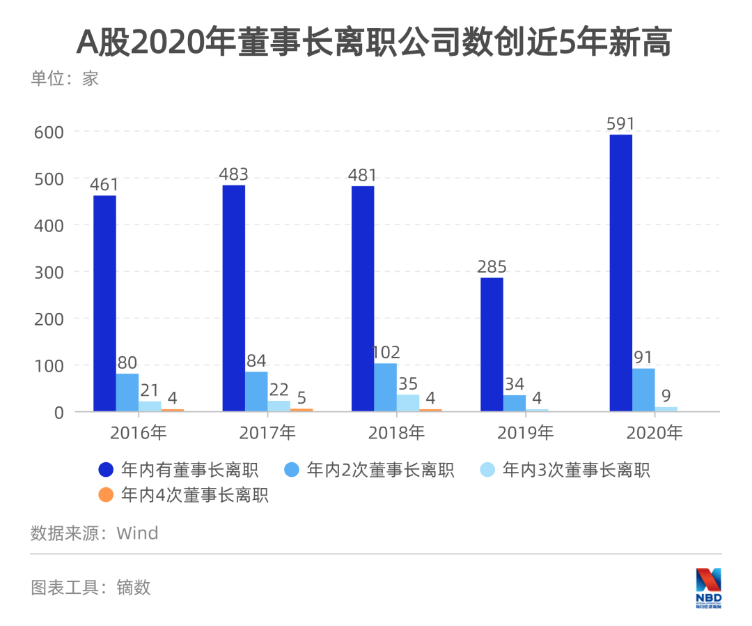 2020年1月1日至2020年12月31日,A股共发生700人次董事长离职事件,涉及591家上市公司。纵览2016年至2020年这五年间的数据,不论是离职事件发生的频次还是涉及的公司数量,2020年度的董事长离职事件都可谓“高发”。