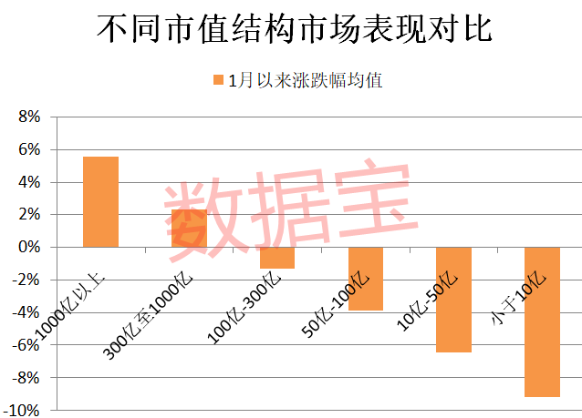 数据宝统计显示,2020年底市值越高的股票在今年表现明显更佳。市值不足10亿的股票1月以来平均跌幅达到9.18%,市值在10亿至50亿之间的股票期间平均跌幅为6.42%。