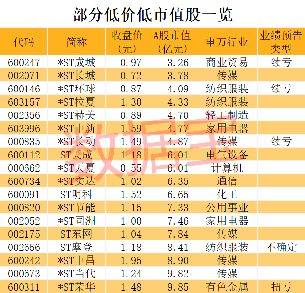 上述2元以下的股票中,不含暂停上市和退市整理期的股票,有18股A股市值不足10亿元,其中*ST成城、*ST长城(维权)市值在3亿元至4亿元之间,距离3亿元的市值红线近在咫尺。市值最低的*ST成城仅3.26亿元,与历史高点相比回撤幅度达到97.52%。