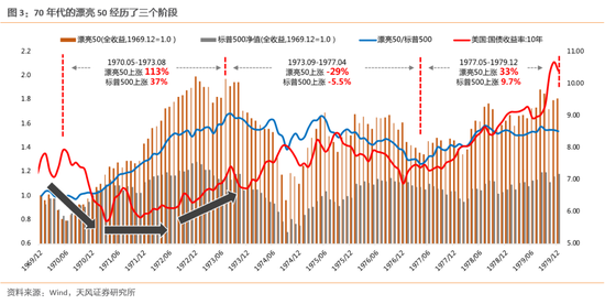 ① 1970.05-1973.08泡沫阶段:漂亮50上涨113%,标普500上涨37%;