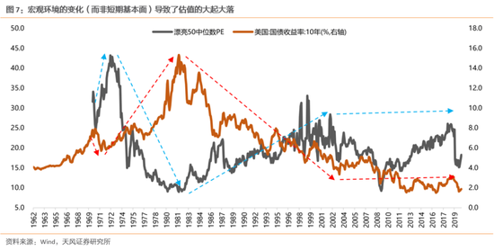(2)80年代初期,滞胀的经济环境接近尾声,美债利率从14%的高位随着美国经济增长中枢下台阶,也开始进入趋势性回落的阶段。对应漂亮50的估值水平,从最低位的不到10倍,开始慢慢回升到20倍以上。