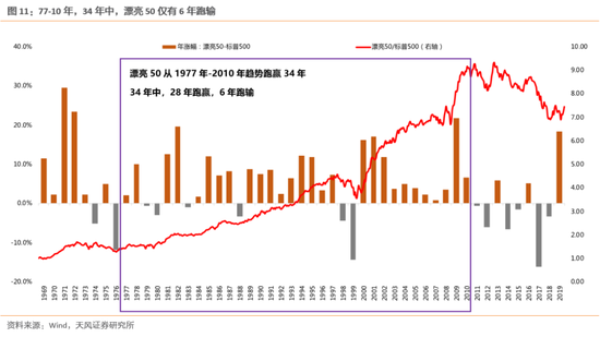 6、从70年代后期开始,漂亮50真正进入了盈利持续推动的超长牛市,长期跑赢标普500。在77-10年代的34年中,其中漂亮50有28年跑赢,6年跑输,以年度为单位计算的跑赢概率达到82.4%。