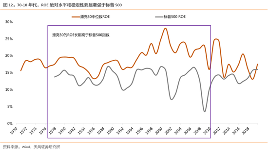 (1)70-10年代,漂亮50具备业绩的稳定性,业绩长期维持在10%-20%之间,是真正意义上当时代的核心资产。其ROE绝对水平和稳定性要显著强于标普500。