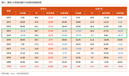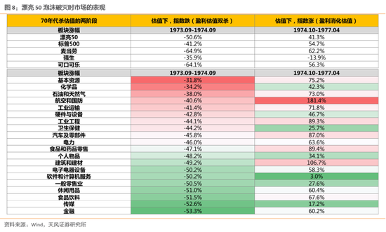漂亮50以暴跌消化高估值,股价下跌50%。同期标普500下跌41%,在此阶段,相对最抗跌的是石油、化工等资源品和军工,对应当时中东战争和石油危机的主要背景环境。