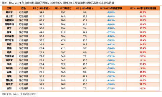 71、72年漂亮50大幅提估值,73、74年漂亮50大幅杀估值,乃至70年代后期整个杀估值的过程中,漂亮50的业绩始终围绕15%左右的水平波动,并没有大起大落,业绩不是漂亮50泡沫破灭的触发因素。