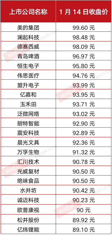 Wind资讯显示,截至1月14日收盘,目前股价在90元到100元之间的上市公司有20家,这其中既有投资者耳熟能详的白马蓝筹美的集团、青岛啤酒、恒生电子、水井坊等,同时也有在科技、战“疫”、新能源等近期主题型行情中脱颖而出的成长股,如万孚生物、汇川技术、欧普康视等。