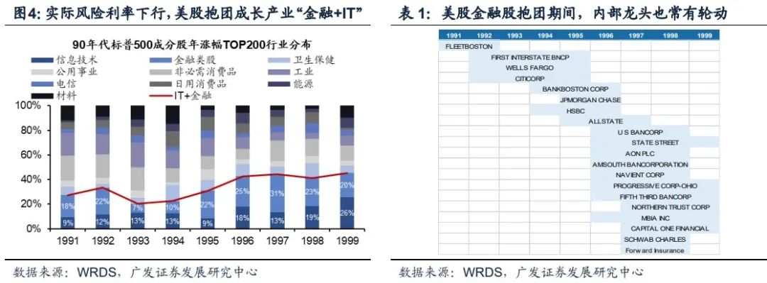 (三)抱团仅是现象,本轮的背后是贴现率下行阶段市场对于远期现金流的一致追逐,行情将逐步扩散。“打破刚兑”、“房住不炒”、“理财收益率下行”,我们自19年初提出的金融供给侧改革驱动实际无风险利率下行已逐步成为市场的共识。DCF模型之下,长期贴现率的下行使得市场对于远端现金流的估值溢价抬升,在此过程中,两条线索相对明确:一是向上动能强劲的产业趋势(远端现金流预期丰厚),二是永续经营的稳定现金流(远端现金流确定性高)。相对来说,前者增速高、空间大但突发因素多因而稳定性偏弱,若发生数据连续不达预期的情况,或迫使投资人重新评估产业发展情况并将视线转向其他快速上行的行业,由此形成“抱团”行业的轮动。贴现率驱动的市场中,15年的传媒、19年的半导体和20年的医药均是此类案例。参考90年代美国金融改革、实际无风险利率下行阶段美股对于高增长行业的抱团(IT+金融),尽管行业发展的趋势未见破坏,但由于新兴产业发展多变,内部龙头股的轮动亦较为频繁。而对于永续经营的稳定现金流,该类企业通常基本面稳定、确定性高,溢价的变化往往取决于行业比较的结果和流动性环境。以上行业发展方兴未艾之时(自身盈利趋势未破坏,也没有产生新的趋势替代),若流动性环境没有发生重大变化,其相对于其他板块的溢价将保持;但若自身盈利趋势性破坏、或被其他确定性相仿、趋势更强的行业所挑战,则将被新的“抱团”所取代(参考美股“漂亮50”经验)。抱团仅是现象,背后是贴现率下行阶段市场对于远期现金流的一致追逐。当前,前期抱团的品种中期盈利趋势未见破坏,但相对性价比之下,其他能够带来优厚现金流的板块将逐步进入投资者的视线,行情将逐步扩散。