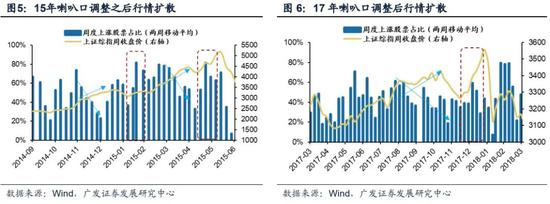 (四)我们在上期周报中提示,“指数上涨+赚钱广度下降” (即上涨公司数量占比下降并低于50%)的喇叭口在历史上并不常见,典型的演绎阶段出现在14年末(券商涨而大多数公司下跌)、15年3-5月(科技涨而大多公司下跌)、17年9-11月(白酒家电涨而大多数公司下跌)。在此之后,市场首先会通过短暂的调整来实现指数走势与赚钱广度的共振,调整时间在1周到1个月不等,指数跌幅在4%-9%之间。随后因为性价比关系的重新调整,赚钱效应将有所扩散,使背离得到修正。