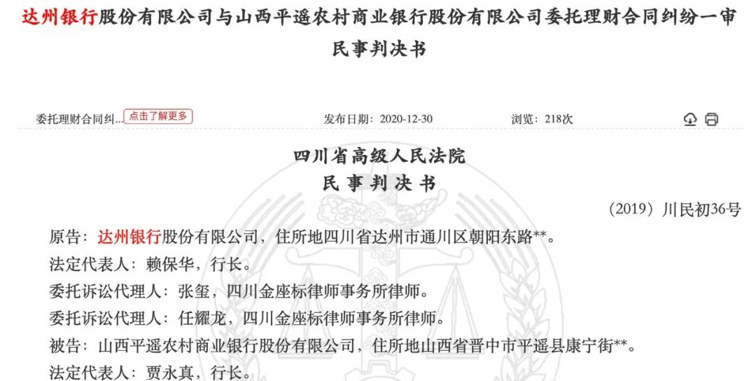 近日,中国裁判文书网披露的一则民事判决书,将达州银行与山西平遥农商行之间的一桩涉及5亿元的委托理财合同纠纷细节公之于众。