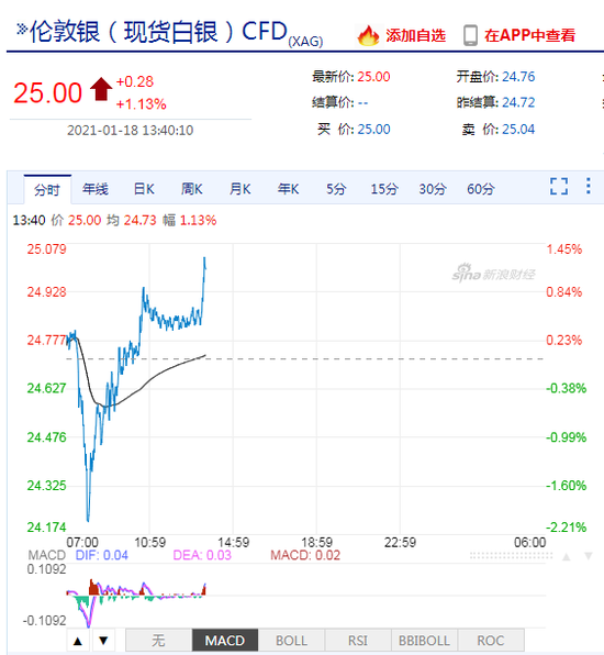 现货白银日内涨幅达1%站上25美元大关,此前一度跌超2%,现报25.00美元/盎司。