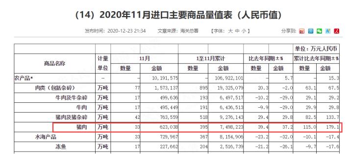 海关数据显示,2020年11月中国猪肉进口量为33万吨,环比基本持平,同比增长39.4%。1-11月我国猪肉进口总量为395万吨,同比增长115%。四季度以来,由于进口冷链食品核酸阳性检出率明显增高,国务院严查进口冻品,港口出货速度较慢。长期来看,随着国内生猪出栏量的逐步增加,加之国内消费偏好鲜肉,后期预计进口量会有一定下滑;