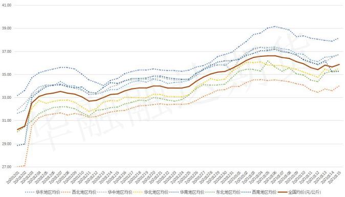 从生猪价格变化情况来看,目前外三元生猪周均价出现小幅下跌,图中也可以看出近三日内价格出现小幅上涨,但整体低于上周水平;能繁母猪价格维持不变;仔猪价格出现上涨,据分析主要原因有两点:一是由于近期饲料价格出现大幅上涨,豆粕一周时间全国均价上涨了320元/吨,而玉米一周时间全国均价上涨了186元/吨,饲料上涨导致养殖阶段成本增加;另一主要原因是近期大部分地区气候温度异常,猪仔发病率和死亡率增高,养猪户急需补栏需求,猪仔市场严供不应求,促进了猪仔价格上涨。