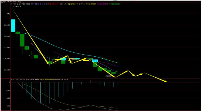 生猪期货自1月8日在大商所挂牌上市以来,价格不断下行。LH2109合约今日收于24725元/吨、LH2111合约收于22650元/吨、LH2201合约收于22690元/吨;就09合约而言技术上看,短期60分钟显示开市至今下跌两波,目前是第二波下跌的A浪调整阶段;指标上看,MACD指标或出现底背离趋势,但未交金叉还未确定需要继续观察,均线系统空头排列,整体空头趋势不变。