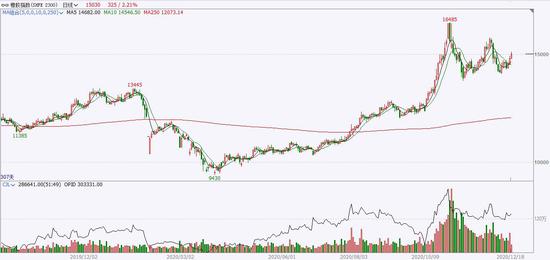 技术上来看,前期总体已经来到沪胶历史低位运行水平的期价预示着自2017年一季度以来的大熊市向下空间已然不大,熊市或接近尾声,在期价已经三次尝试上攻年线失败之后,已经拉低走平的年线对期价的压制作用大幅下降,在基本面改观背景下,行情于8月再次上攻年线并取得成功,随后两月站稳年线使得技术彻底转强,随着市场对产区受天气扰动难以提量的炒作,10月中旬沪胶再次大幅上攻走高,文华橡胶指数来到16000点以上,创出近两年新高,其后至今仍然维持14000点以上的高位运行态势。