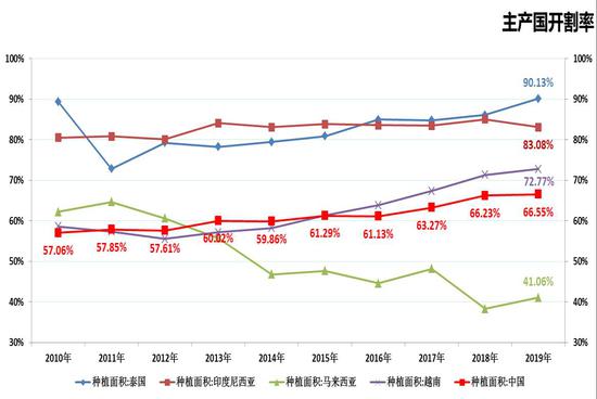 主产国开割方面,泰国开割率连续三年保持提升,2019年开割率居主产国之首,达到90%以上,印尼次之达到83%以上,马来西亚方面开割率仅有41%左右,越南提升速度最快,2012年以来保持了较快的连年提升态势,2019年来到73%左右,国内开割率稳步提升,已经连续4年保持小幅增长态势,2019年开割率达到66.5%以上的较高水平。
