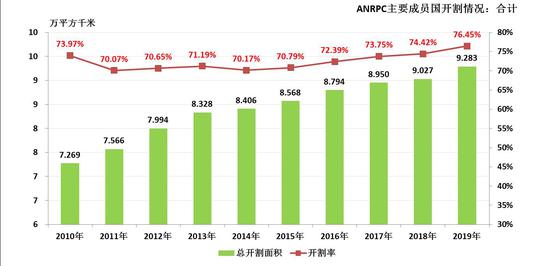 相比种植面积的稳定化,ANRPC成员国开割面积自2010年以来一直保持增加态势,2019年总体开割面积已经达到9.283万平方千米,开割率自2014年以来一直保持提升,2019年已经达到76.45%的历史高位水平,但2020年由于产区胶工短缺及新冠疫情影响,尽管数据暂未公布,但开割率料将难免下滑。