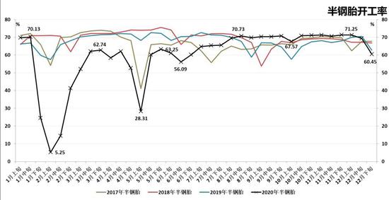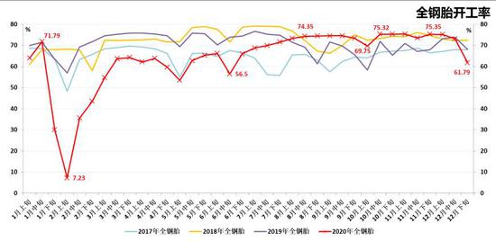 2020年面对多重压力,轮胎行业开局非常差,疫情影响十分严重,不仅在需求上打击轮胎产业,轮胎工厂工人工作,尤其山东地区,在一季度也受到了很大影响,直接导致上半年,尤其是一季度后半程至二季度上半程时间段,轮胎行业开工率大幅不如往年,然而下半年以来,随着国内车市不断推动及国内疫情的明朗,轮胎开工率不断回升,从8月开始反而超过了过去3年(尤其是2018年的轮胎开工旺盛年)的同期状况,高开工持续性也非常良好,一直持续到12月上旬,期间,全钢胎开工率基本维持在69.75%-75.35%之间的高位态势,半钢胎开工率基本维持在67.57%-71.25%之间的高位水平,近期才出现较为明显的下滑。