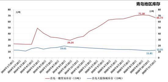 青岛地区方面,据相关资讯公司统计,截止11月22日,青岛地区天然橡胶一般贸易库存合计66.73万吨,2020年自1月份以来还是经历了较为明显的增库阶段,此项指标在9月25日见顶,最高来到71.3万吨,之后逐月下降;青岛地区保税库存方面,2020年总体呈现缓慢下降态势,由1月17日的16.5万吨附近缓慢下降至10月25日的11.81万吨,11月25日统计数字显示,保税库存小幅回升来到12.55万吨。总体来看,目前青岛地区天胶库存依然处在9月份以来的缓慢去库状态。