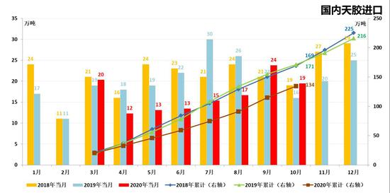 由于前两个月数据缺失,根据国内海关现有统计数字,2020年3月至10月,中国总共进口天然橡胶134万吨,与去年同时间段的171万吨相比,下降21.5%,进口明显减少,同比2018年同时间段的169万吨,下降20.7%。分月份来看,2020年天胶总体进口态势弱化明显,除了3月数据维持同比小幅正增长,此后5个月均呈现大幅同比下滑态势,9月才开始同比转正,但10月进口再次环比下降,11月及12月数据可能季节性环比回升,但幅度预计有限,单月进口或不足20万吨。