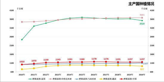 主产国种植面积方面,2020年泰国种植面积达到352万公顷,相比去年下降10万公顷,印尼种植面积最大,达到368.1万公顷,相比去年小幅减少0.2万公顷,马来西亚增加2.3万公顷达到110.7万公顷,越南相比去年减少3.5万公顷降至92.7万公顷,国内种植面积总体稳定,与去年持平,维持在115.7万公顷。