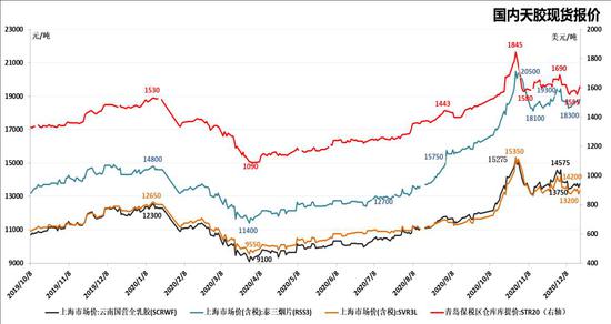 现货方面,2020年天胶现货市场报价走势节奏基本跟随沪胶,各胶种在一季度末创出熊市价格新低之后,于10月末创出阶段性回升高点,目前维持高位运行。典型胶种来看,上海市场国产全乳由最低9100元/吨最高涨至15275元/吨,最大涨幅67.9%;上海市场泰三烟片价格涨势更强,并首先来到2万整数关口,由最低11400元/吨最高涨至20500元/吨,最大涨幅79.8%;青岛市场泰产20号胶美金价,由最低1090美元/吨最高涨至1845美元/吨,最大涨幅69.3%。